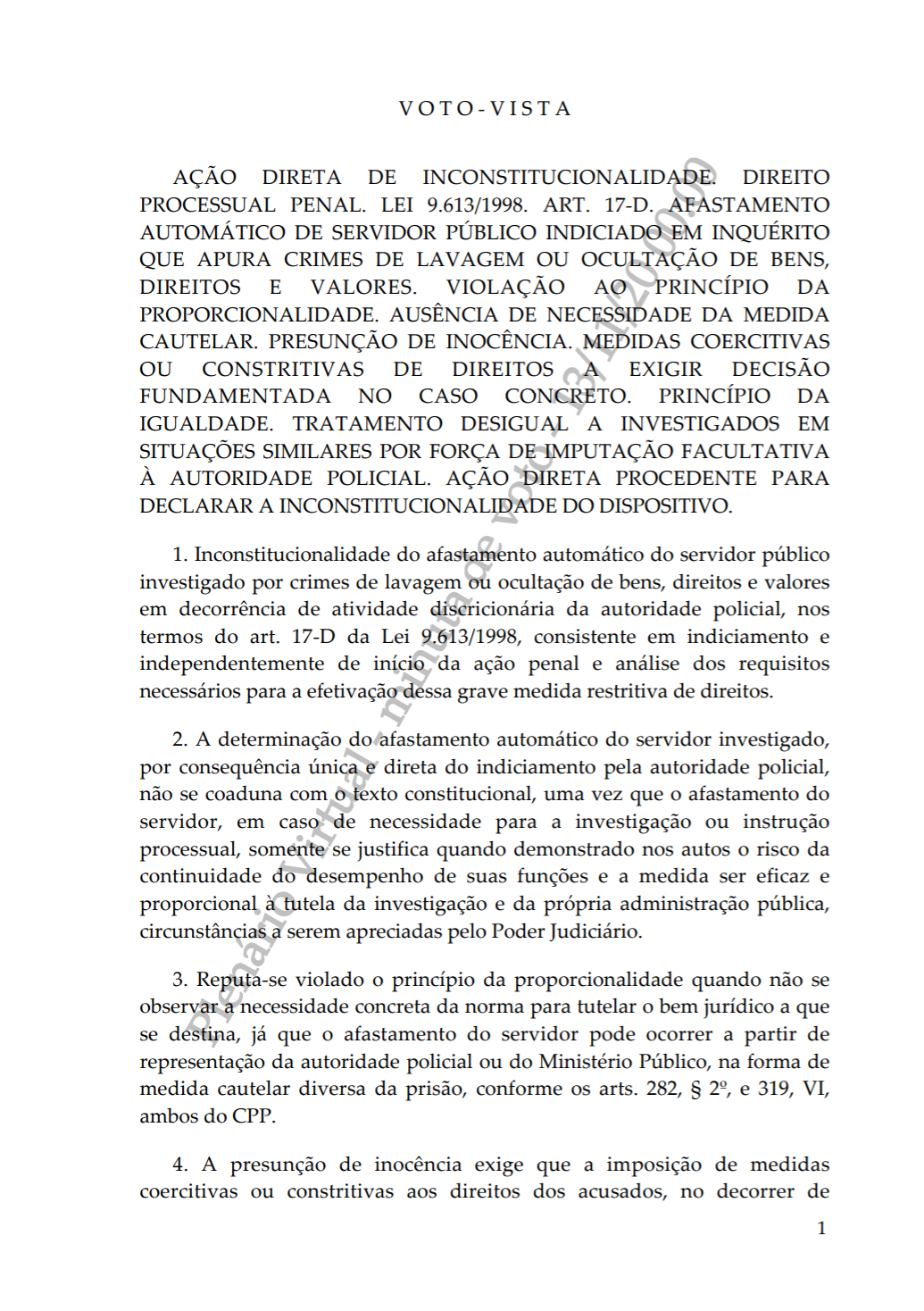 Por maioria, o Plenário do STF julgou inconstitucional o art. 17-D da Lei de Lavagem de Dinheiro que determina o afastamento de servidores públicos em caso de indiciamento de crimes de lavagem de dinheiro ou ocultação de bens. ⠀ ⠀⠀