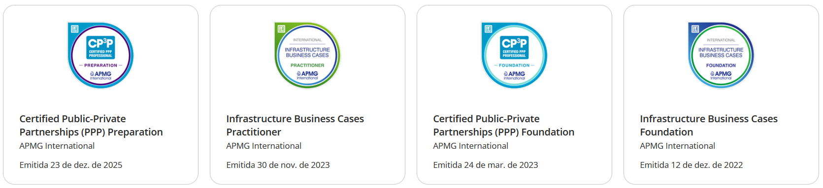 • Certificado em Infrastructure Business Cases International Foundation (IBC-F) e Certified Public-Private Partnerships Foundation (CP3P), ambos pela APMG